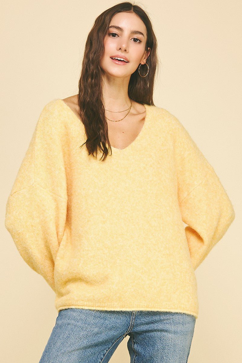 Brighten your day with our Soft V-Neck Relaxed Sweater — the ultimate blend of comfort and effortless style. Crafted from a plush, fuzzy knit in a cheerful butter-yellow hue, this sweater brings a cozy yet uplifting touch to your wardrobe. The relaxed, slouchy silhouette and dropped shoulders create an easy, lived-in feel, while the flattering V-neckline adds a hint of femininity.