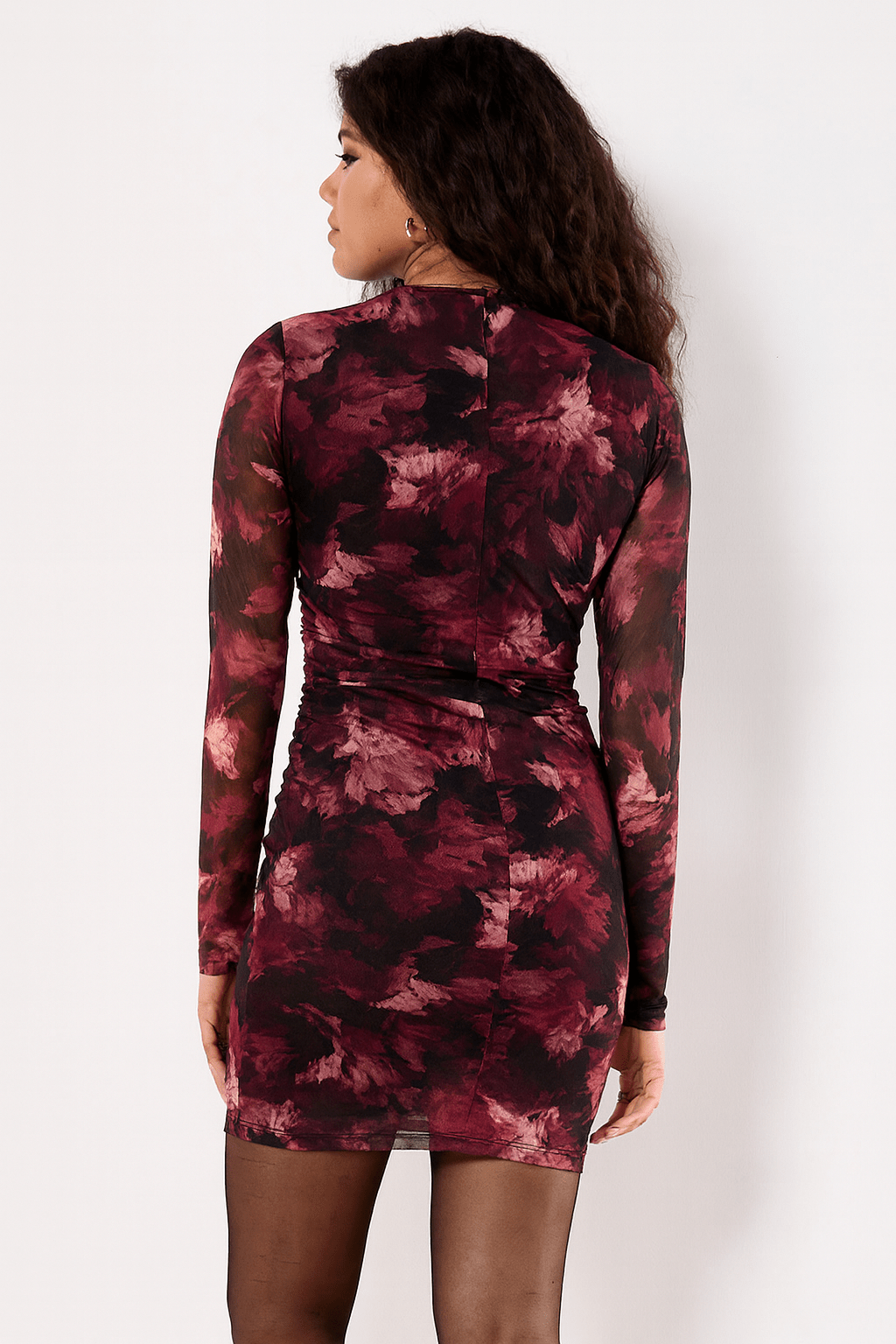 Turn heads in this long sleeve mesh mini dress, featuring a moody floral print in rich berry and black tones. The body-hugging silhouette is enhanced with subtle ruching for a flattering, curve-skimming fit, while the sheer long sleeves add an alluring contrast. A high neckline balances the shorter hemline, making it the perfect statement piece for date nights, parties, or a night out with the girls. Pair it with sheer tights and heels for a chic evening look, or dress it down with boots and a leather jacket for a more edgy vibe.