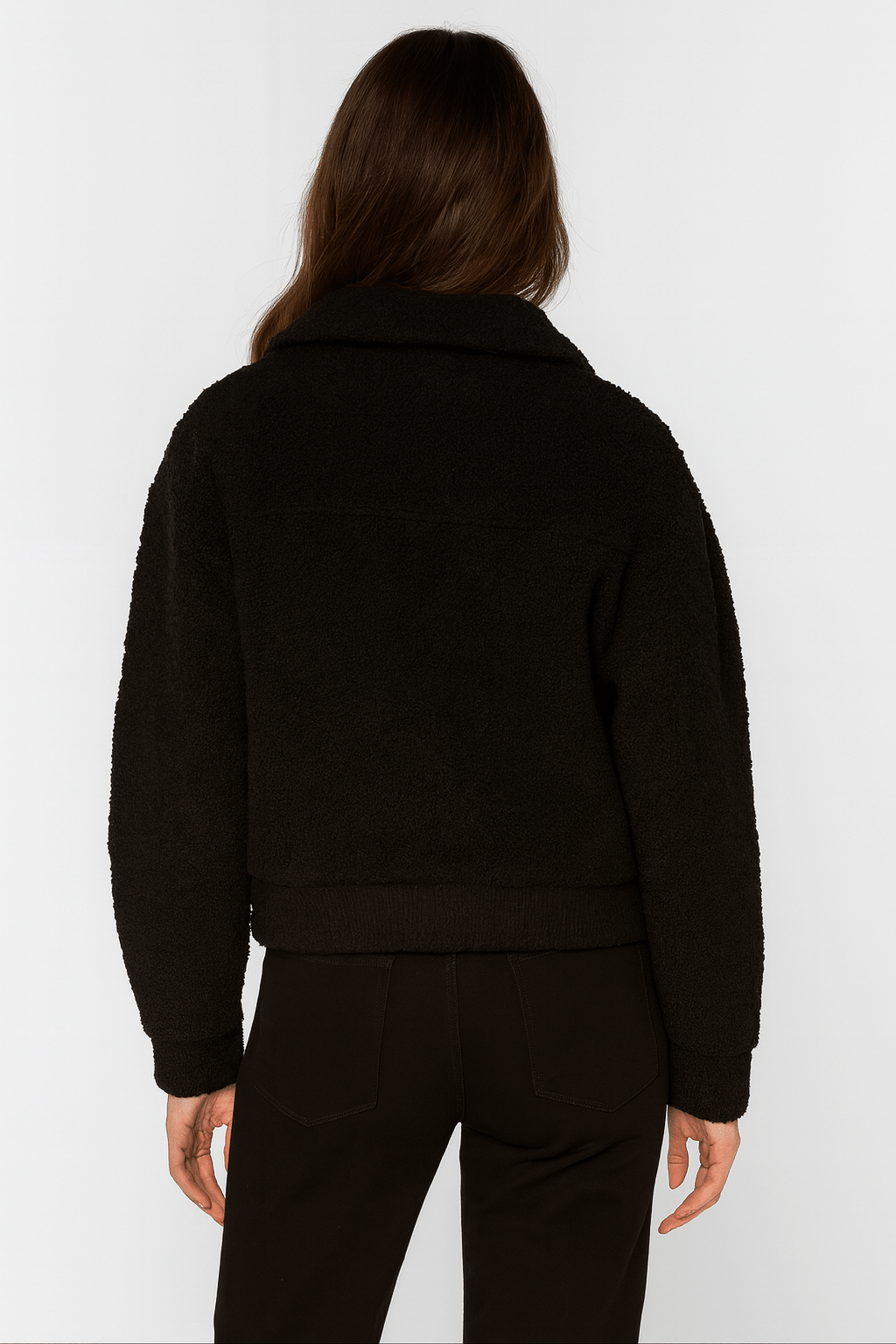 Stay effortlessly cool and cozy in this black cropped zip-up jacket. Designed with a textured boucle-style finish, it brings both warmth and modern edge to your wardrobe. The boxy silhouette, flap chest pockets, and gold zip closure give it a utility-inspired vibe, while the ribbed hem and cuffs add structure and comfort.