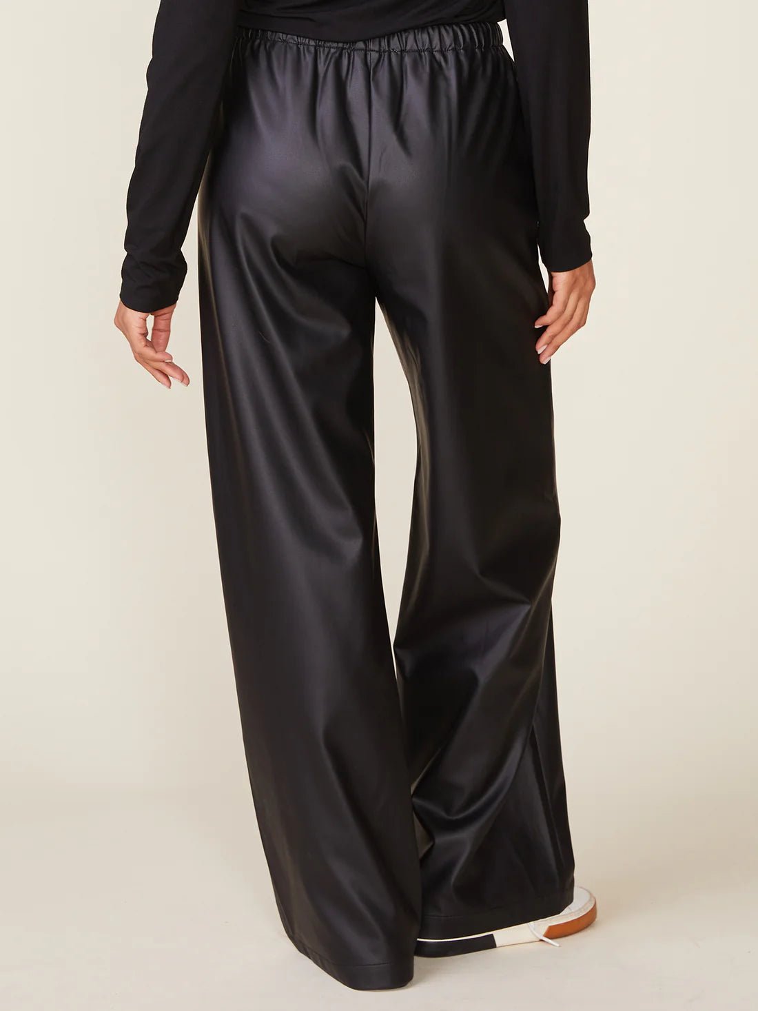 Sleek, modern, and undeniably chic — these black vegan leather pants redefine casual cool. Crafted from soft, supple faux leather with a luxe sheen, they deliver style without sacrificing comfort. The drawstring waist and wide-leg silhouette create an effortlessly laid-back feel, making them perfect for pairing with everything from cozy knits to structured blazers.