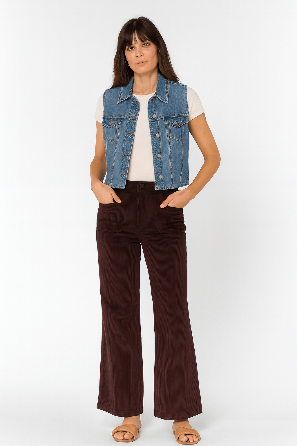 Elevate your everyday wardrobe with these chic burgundy corduroy pants. Crafted from soft, textured corduroy, they feature a flattering high-rise fit and wide-leg silhouette that blends retro charm with modern style. The front patch pockets add both function and a touch of vintage flair, while the structured waistband with belt loops ensures a polished finish.