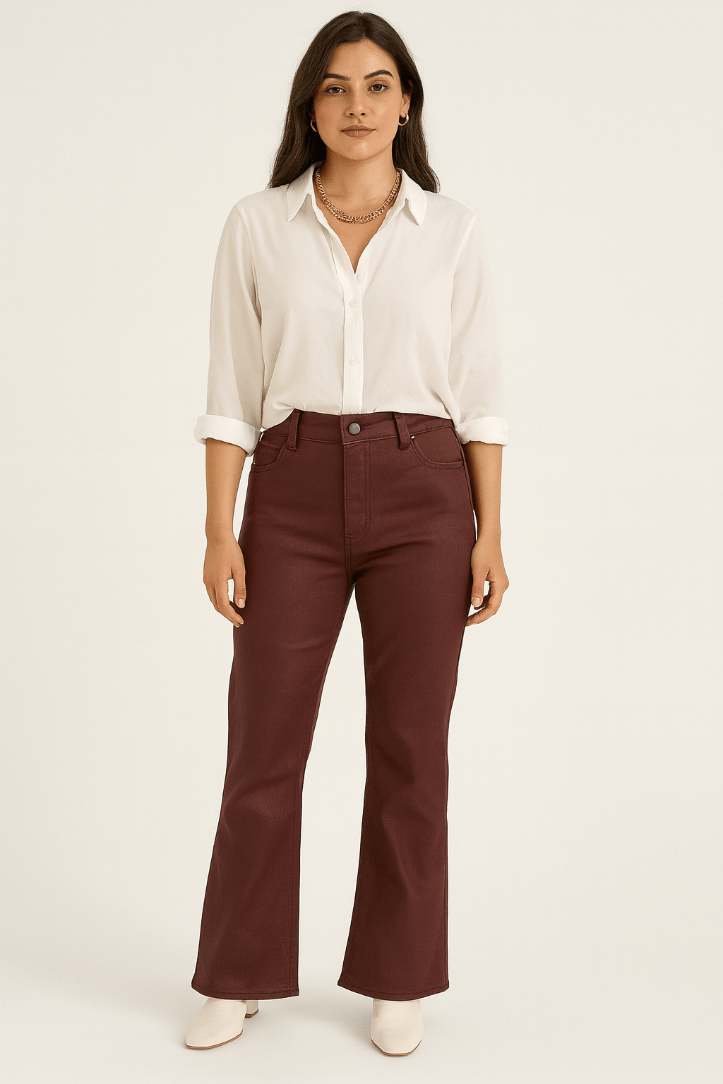 Elevate your everyday denim game with these dark cherry or sage flare pants, a modern twist on a timeless silhouette. Designed with a high-rise fit, they sit comfortably at the waist while elongating your legs with a subtle flare finish. The rich burgundy hue makes them a chic alternative to classic black or blue, offering endless styling versatility—from pairing with neutral blouses for work to sleek bodysuits for a night out. Crafted from a structured yet flexible fabric, these pants strike the perfect balance between comfort and polish.