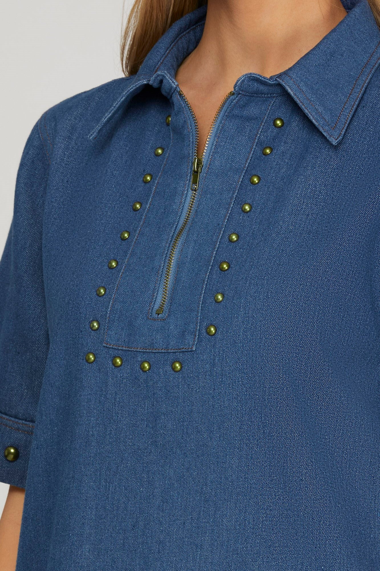 SHORT SLEEVE 1/2 ZIP STUDED DENIM MINI DRESS WITH POCKETS