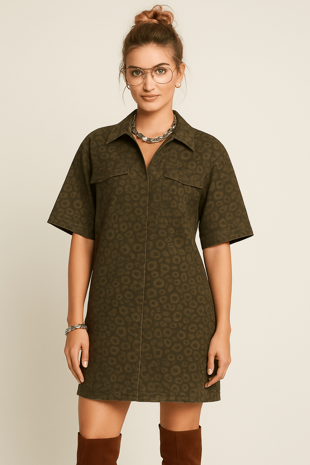This mini dress features a short-sleeve woven design with a washed animal print, collar, detailed stitching, and convenient pockets. The model is 5'8" and wears a size small. Made from 55% cotton and 45% polyester, it combines comfort with style.