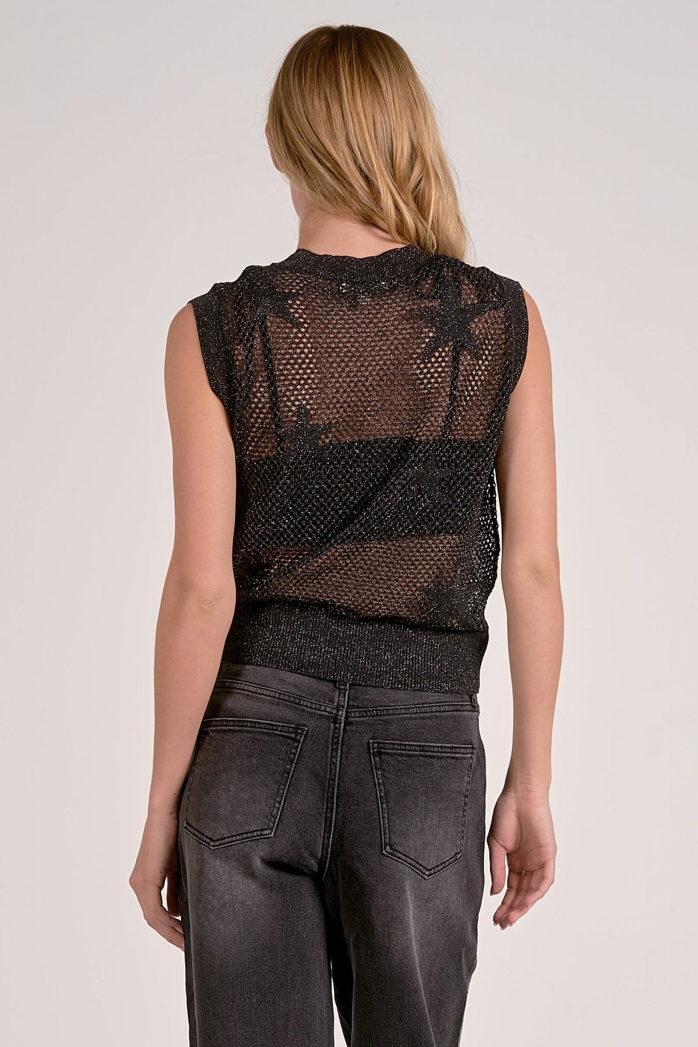 Make a bold statement with this sheer black knit tank, designed with an edgy mix of texture and shimmer. Featuring a semi-sheer mesh body woven with subtle metallic threads, it offers just the right amount of sparkle while keeping a lightweight, breathable feel. The ribbed hem and crew neckline give it a polished finish, while the sleeveless cut makes it versatile for layering or styling on its own. Perfect for pairing with bralettes, statement pants, or leather bottoms for a daring night-out look.