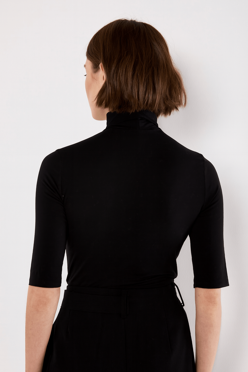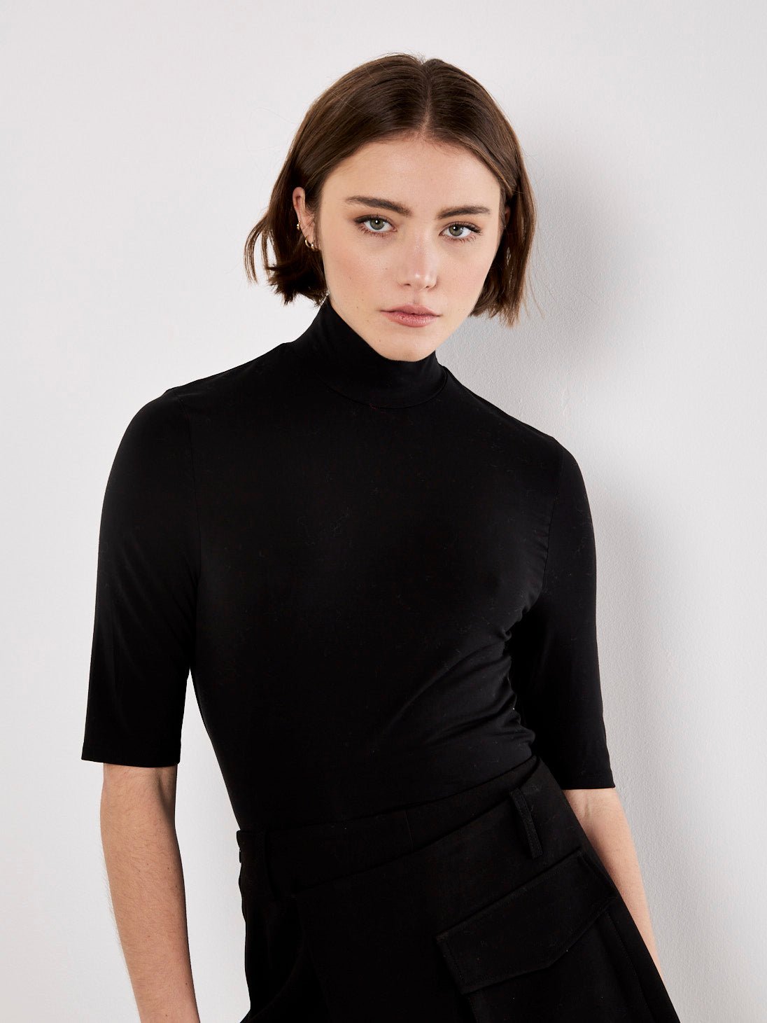 Elevate your wardrobe with this sleek black mock-neck top, a timeless staple designed for both layering and standalone wear. Crafted from a smooth, stretchy fabric, it features a fitted silhouette that flatters your figure while offering all-day comfort. The half sleeves add a touch of modern sophistication, making it a versatile piece you can dress up or down. Pair it with tailored trousers and a blazer for work, or tuck it into a skirt or jeans for a sleek, everyday look.