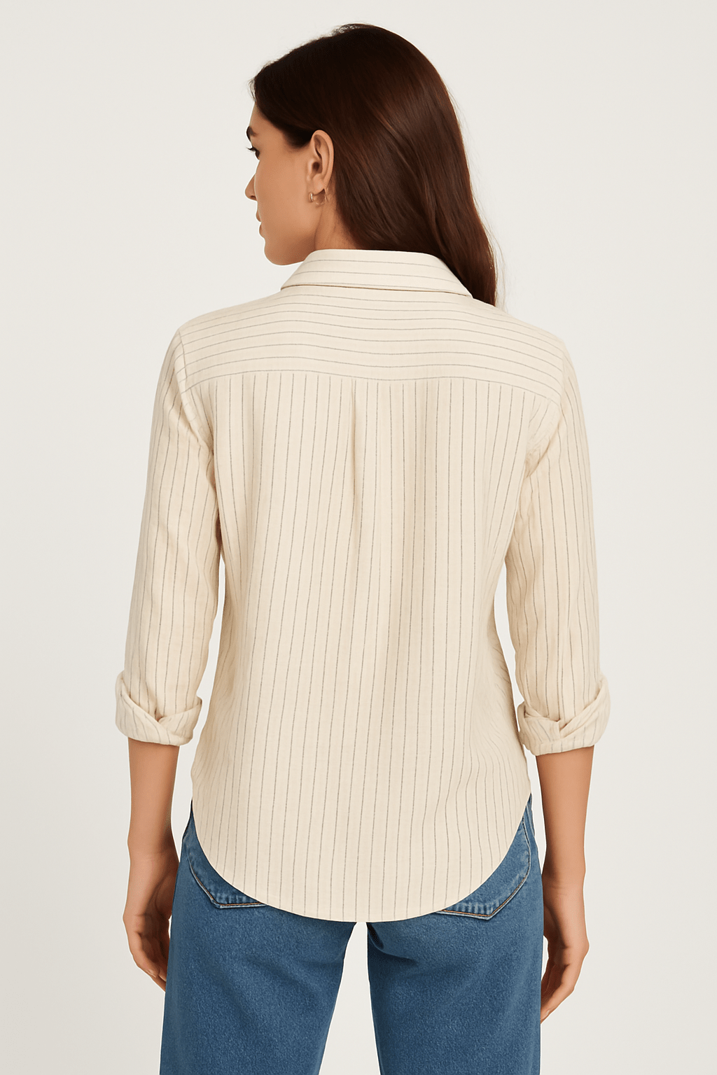 Effortlessly classic, this striped button-down blouse is a wardrobe essential you’ll reach for time and time again. Designed in a soft neutral tone with subtle vertical stripes, it creates a flattering, elongated silhouette. The relaxed fit is paired with a single chest pocket, button front closure, and roll-tab sleeves that can be styled up or down depending on the occasion. Perfect for the office, casual weekends, or layering under a blazer, this versatile blouse transitions seamlessly from work to play.