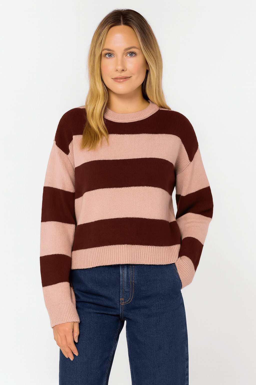 Cozy up in playful stripes with this soft knit sweater. Designed in a cropped silhouette, it features wide horizontal stripes in rich burgundy and blush pink for a bold yet feminine touch. The crew neckline and relaxed fit make it a versatile layering piece, while the ribbed cuffs and hem add structure to the laid-back shape.