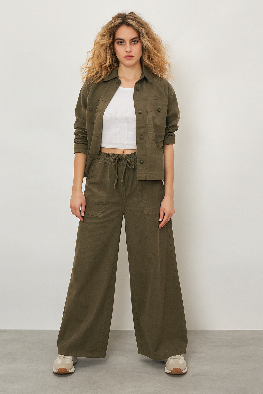 Effortless utility meets relaxed sophistication in the Olive Wide-Leg Pants. Made from soft, textured fabric with a fluid drape, these pants combine comfort and polish with ease. The high-rise waist features an adjustable drawstring for a custom fit, while the wide-leg silhouette flatters every shape. Perfect for transitioning from casual days to elevated evenings, they bring a modern twist to the classic workwear look.