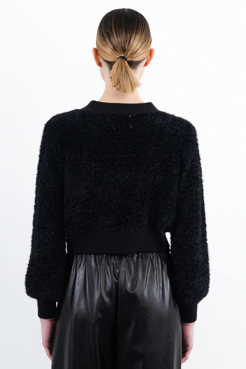 Add a touch of glam to cozy season with this Black Fuzzy Cropped Cardigan. Made from an ultra-soft textured knit, this cardigan combines comfort with statement details. The relaxed cropped silhouette gives it a modern, flattering shape, while the standout jewel-encrusted buttons elevate the look with a hint of vintage charm. Designed with a deep V-neckline and ribbed trim for a polished finish, it’s the perfect mix of chic and cozy. Whether you dress it up with high-waisted trousers or keep it laid-back with denim, this cardigan makes everyday style feel effortlessly luxe.