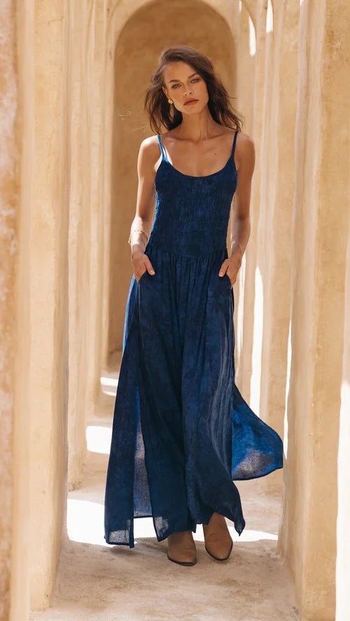 Soft, romantic, and effortlessly wearable — this indigo maxi dress is a warm-weather dream. The smocked bodice molds comfortably to your shape, offering both stretch and support, while the flowy, full-length skirt adds graceful movement with every step.